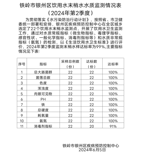 2024年第二季度银州区饮用水末梢水水质监测情况表