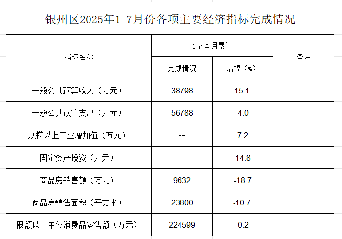 【统计数据】2025年银州区1-7月份主要经济指标完成情况