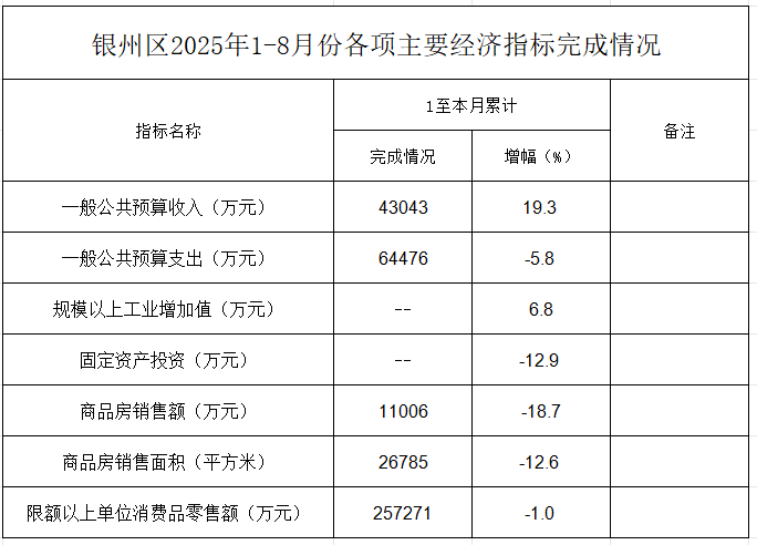 【统计数据】2025年银州区1-8月份主要经济指标完成情况